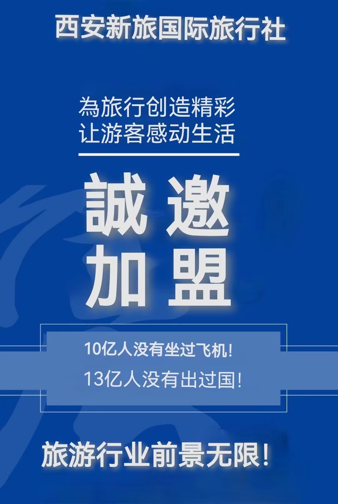 歡迎各地的有識之士能加盟到我們團隊中來,資源共享、共謀發(fā)展!為旅行創(chuàng)造精彩,讓游客感動生活;選擇陜新旅,走遍全世界!