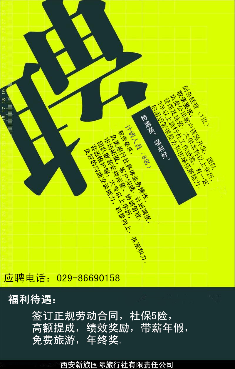 任職要求:旅游相關(guān)專業(yè)大學(xué)本科或以上學(xué)歷,旅游行業(yè)2--3年工作經(jīng)驗(yàn),有一定的組織管理能力,市場(chǎng)拓展能力,抗壓能力強(qiáng);性別不限,25-35周歲。
